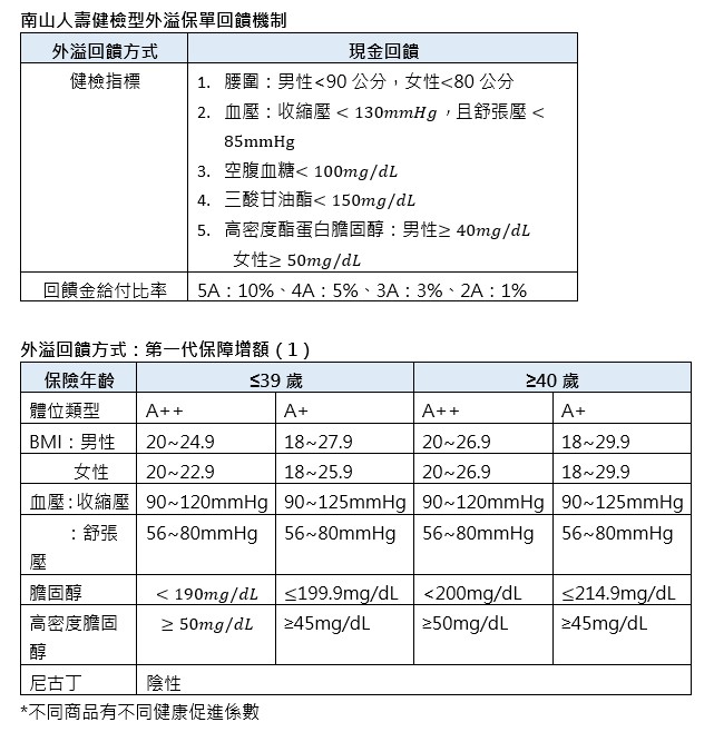 南山人壽在2020年推出的外溢保單,首創以5A指標作為回饋機制的依據,即(1)男性腰圍小於90公分、女性小於80公分;(2)血壓收縮壓小於130mmHg且舒張壓小於85mmHg;(3)空腹血糖小於100mg/dL;(4)三酸甘油酯小於150g/dL;(5)高密度酯蛋白膽固醇男性大於等於40mg/dL、女性大於等於50mg/dL,依健檢結果的達標項目數,南山人壽提供現金回饋比率1%到10%,藉以提醒保戶注意腰圍、血壓、血糖、血脂、好的膽固醇等五項代謝症候群警戒指標。