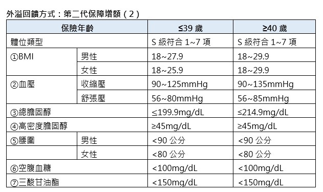 另外,南山人壽亦有使用體位類型核驗增加保障額度的外溢回饋設計,在第一代的保障增額外溢設計中,以取得體位類型A++級為最佳,其次依序為A+以及A。其中,A++即各項健檢指標全數達標,可獲得最高的健康促進係數以供增加保障,其次的體位類型A+亦可享有保障增額回饋。後續隨著南山人壽健康險外溢保單化的推動,再推出更簡明區分A級與S級兩種體位類型的第二代保障增額外溢設計,其中各項健檢指標全數達標者體位類型為S級,可享有保障增額的外溢回饋。