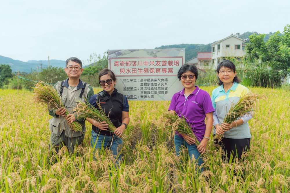圖說 : 清流部落川中米友善栽培專案第一年成果豐碩,左起為農業部生物多樣性研究所所長楊嘉棟、南投縣仁愛鄉互助國小校長梁秀琴、安達人壽董事長李崇言、農業部臺中區農業改良場場長楊宏瑛。