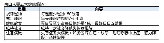 失智症雖不可逆,但可藉由健康生活習慣與及早預防來減緩失智速度。南山人壽在2025年蒐集與整理國內外權威單位的健康資訊,提出五大健康倡議:一、規律運動,最好每週運動150分鐘;二、充足睡眠,建議每天睡眠時間約7~9小時,且最好在午夜前入睡;三、健康飲食,依「國民每日飲食指南」,蛋白質至少占每日總熱量10%,最好能日日五蔬果(註6),亦可參考麥得飲食法;四、維持社交,若長期缺乏社交及人際互動,失智風險恐增加30%;五、注意病徵,提早檢測,儘早治療,避免病情快速惡化。