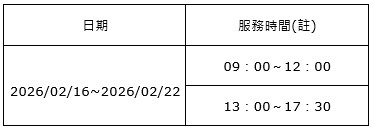 - 客戶服務專線春節專人服務時間如下表:(其餘時段提供IVR查詢及語音留言服務)