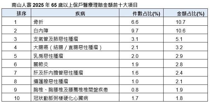 南山人壽分析,65歲以上保戶醫療理賠金額第一大是「骨折」,約占2025年該年齡段醫療理賠金額的11%,如同衛生福利部國民健康署的調查,國內65歲以上長者約每6人就有1人曾跌倒,且每12位長者中,就有1人曾因跌倒就醫。跌倒是造成65歲以上長者受傷住院和急診的最主要原因,其發生率會隨年齡增加而提高。長者骨折開刀,可能會用到自費的骨板、有些甚至要置換人工關節,住院時的相關費用與出院後行動不便的看護費,林林總總加起來可能要20到30萬元不等,與保單平均理賠骨折金額約有150%~230%的差距;另外如「關節炎」是65歲以上保戶醫療理賠金額第六大,「胸椎、胸腰椎及腰薦椎椎間盤疾患」則是第九大,保戶若是使用自費醫材,報價也是數萬到數十萬元以上,也就是實際醫療與休養復能費用,可能與保險理賠金額差距達50%~65%以上。